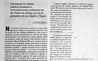 The exhibition brought together sixteen Brazilian and American visual artists, comprising a representative sample of the American avant-garde and comparable Brazilian artists. Participating artists: José Roberto Aguilar, David Amico, Antonio Dias, Jill Giegerich, Marco G. Gianotti, Joe Goode, Jorge Guinle, Roger Herman, Fabio Miguez, John Millei, Sabina Ott, Flavia Ribeiro, Sergio ST Romagnolo, Dudi Maia Rosa, Pauline Stella Sanchez, and Nelsen Valentine. Special guest musicians included João Bosco and Uakti Group.