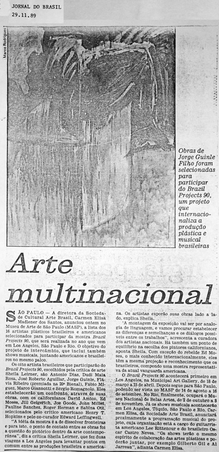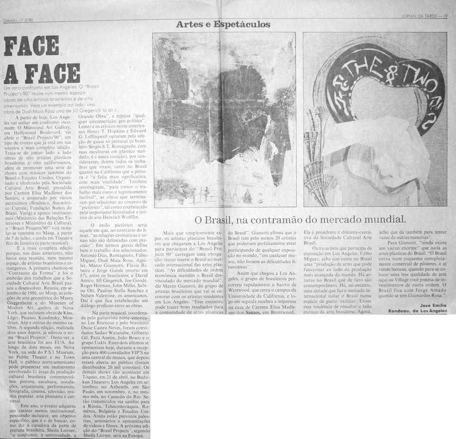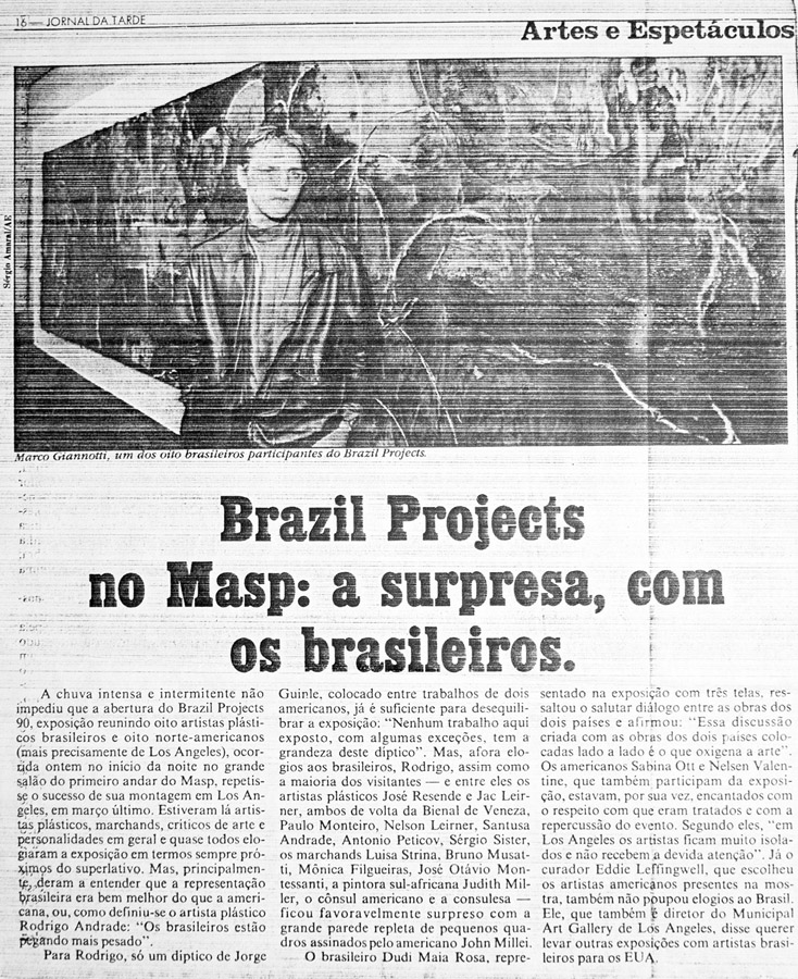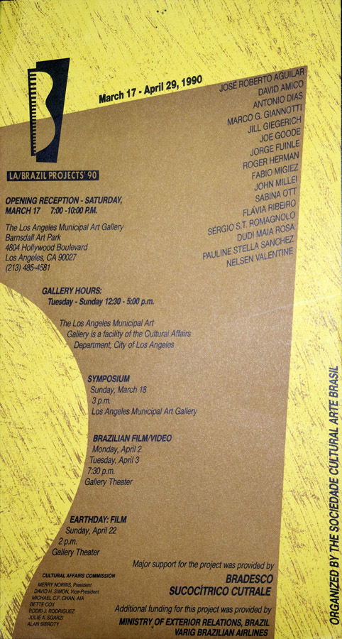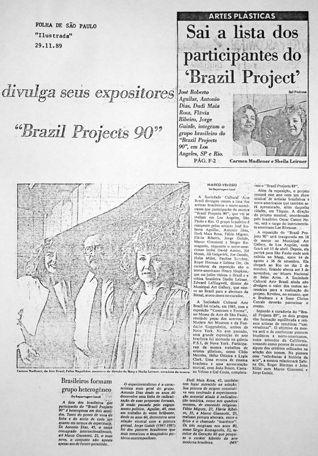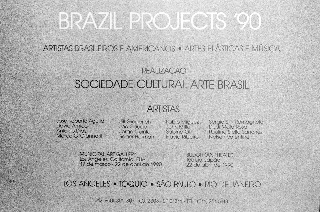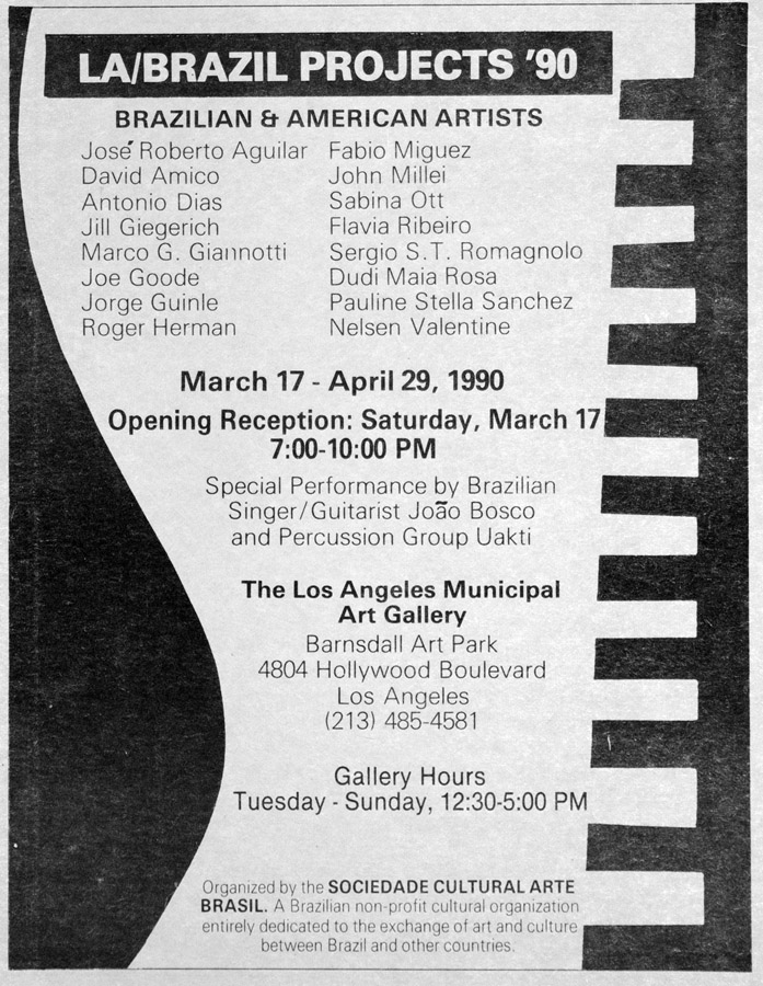 The exhibition brought together sixteen Brazilian and American visual artists, comprising a representative sample of the American avant-garde and comparable Brazilian artists. Participating artists: José Roberto Aguilar, David Amico, Antonio Dias, Jill Giegerich, Marco G. Gianotti, Joe Goode, Jorge Guinle, Roger Herman, Fabio Miguez, John Millei, Sabina Ott, Flavia Ribeiro, Sergio ST Romagnolo, Dudi Maia Rosa, Pauline Stella Sanchez, and Nelsen Valentine. Special guest musicians included João Bosco and Uakti Group.