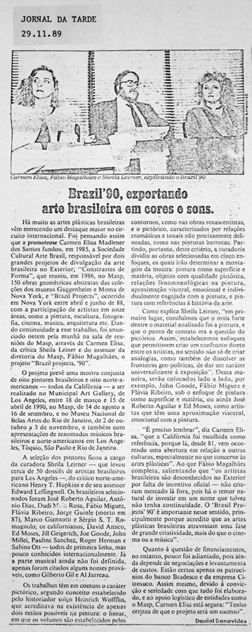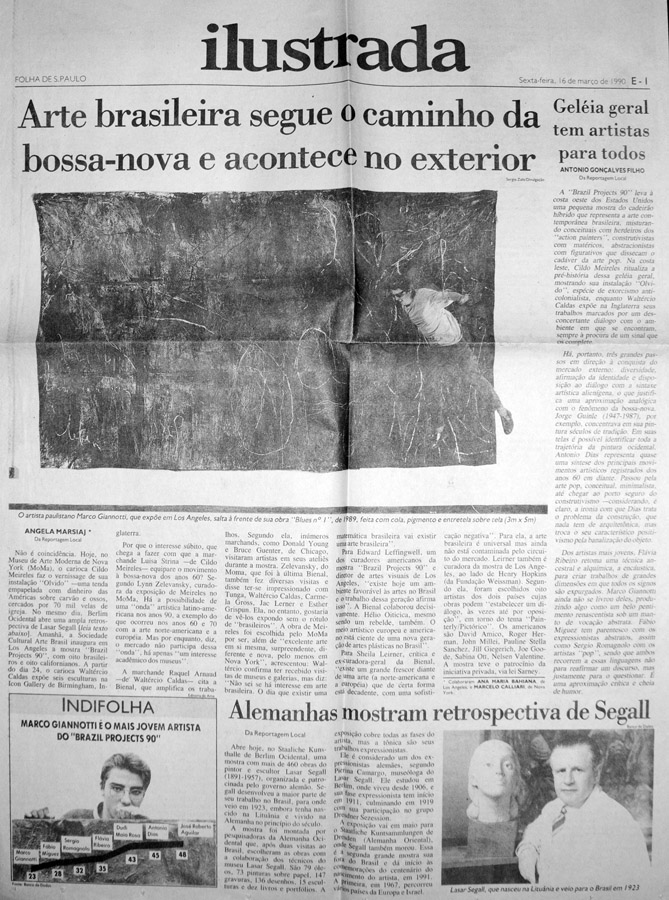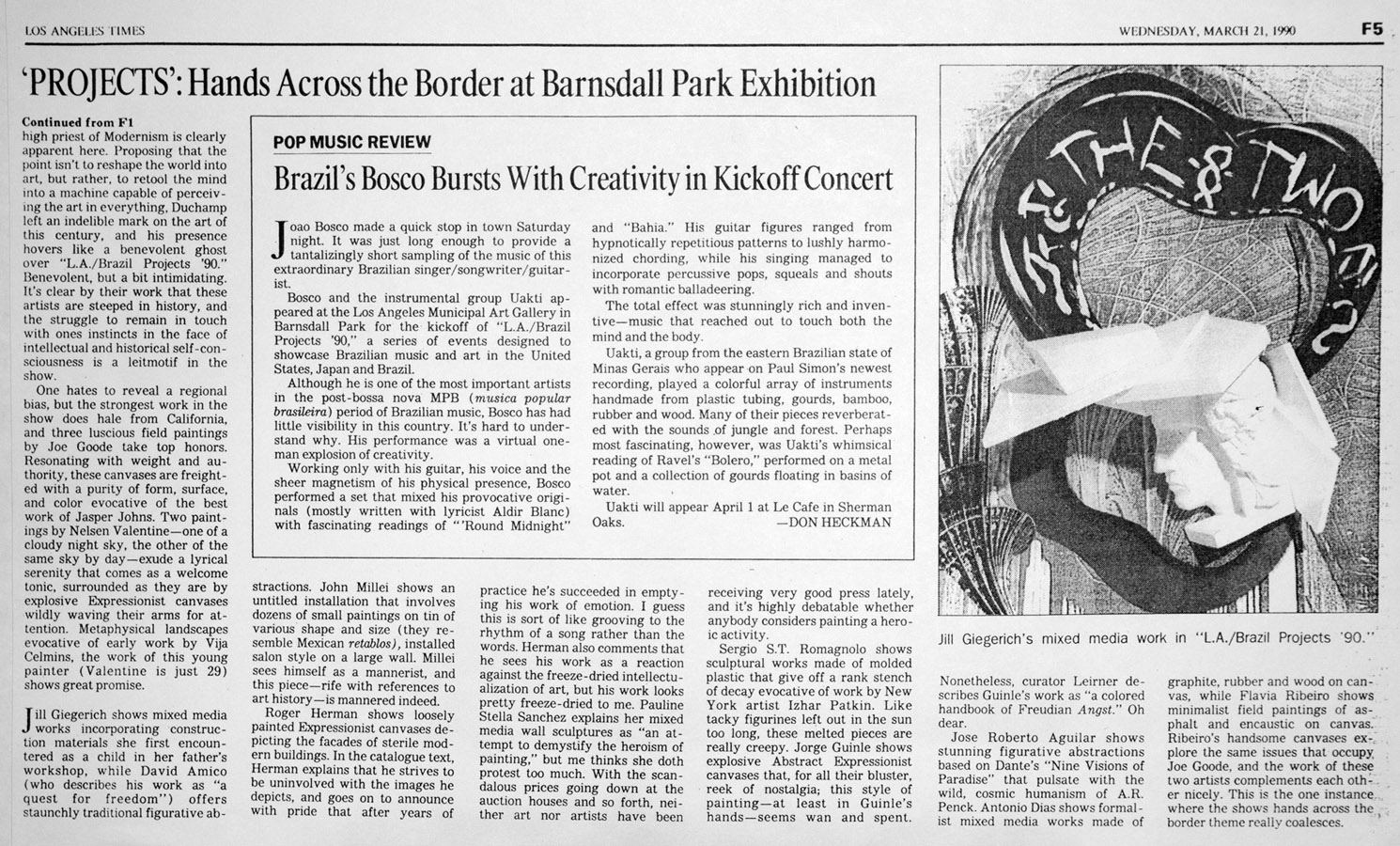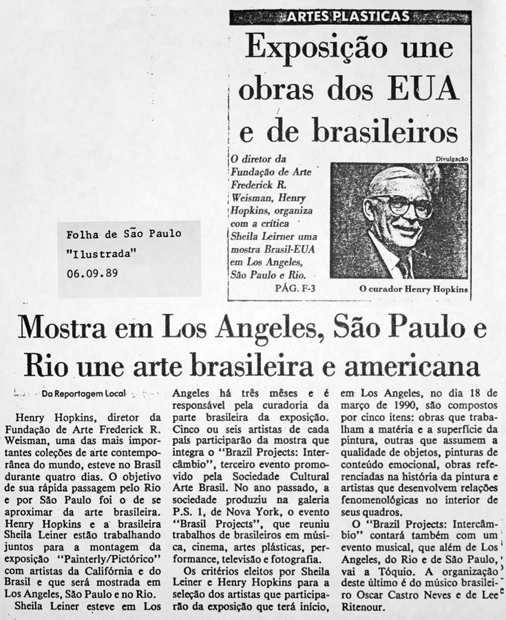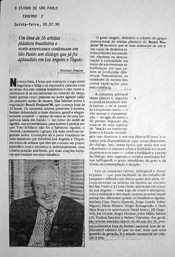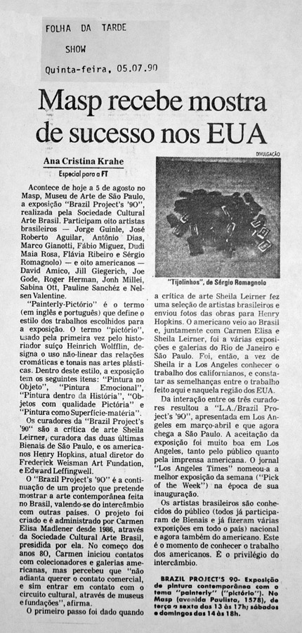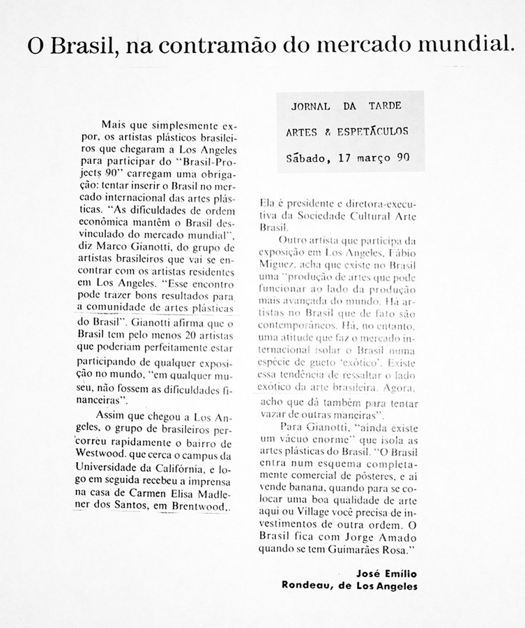 The exhibition brought together sixteen Brazilian and American visual artists, comprising a representative sample of the American avant-garde and comparable Brazilian artists. Participating artists: José Roberto Aguilar, David Amico, Antonio Dias, Jill Giegerich, Marco G. Gianotti, Joe Goode, Jorge Guinle, Roger Herman, Fabio Miguez, John Millei, Sabina Ott, Flavia Ribeiro, Sergio ST Romagnolo, Dudi Maia Rosa, Pauline Stella Sanchez, and Nelsen Valentine. Special guest musicians included João Bosco and Uakti Group.
