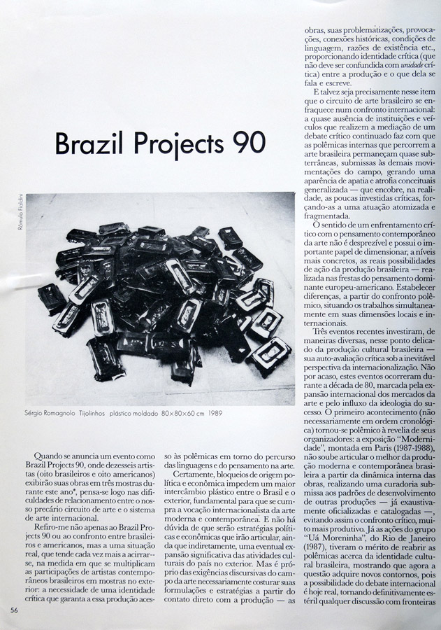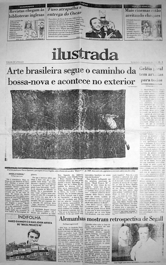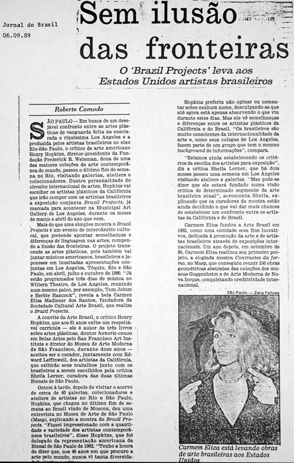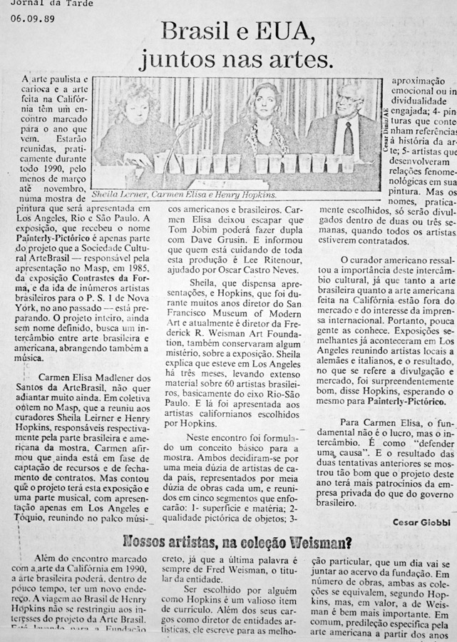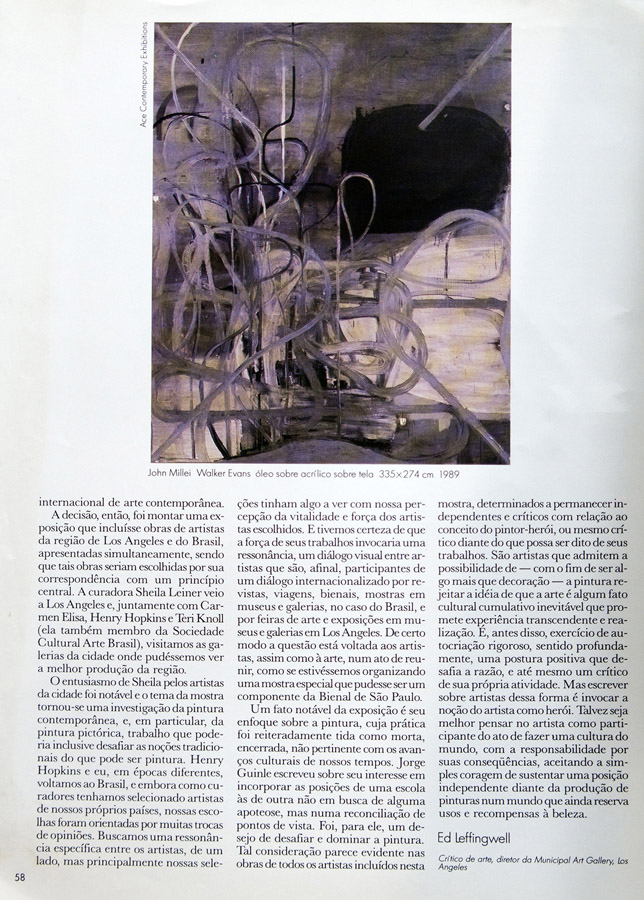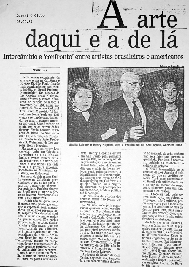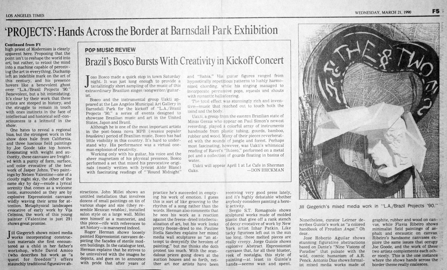 The exhibition brought together sixteen Brazilian and American visual artists, comprising a representative sample of the American avant-garde and comparable Brazilian artists. Participating artists: José Roberto Aguilar, David Amico, Antonio Dias, Jill Giegerich, Marco G. Gianotti, Joe Goode, Jorge Guinle, Roger Herman, Fabio Miguez, John Millei, Sabina Ott, Flavia Ribeiro, Sergio ST Romagnolo, Dudi Maia Rosa, Pauline Stella Sanchez, and Nelsen Valentine. Special guest musicians included João Bosco and Uakti Group.