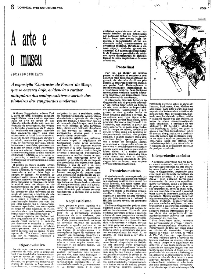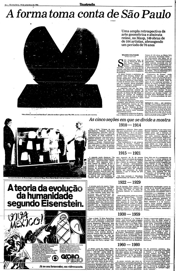 Contrastes of Form brought together 150 abstract geometric works of art from the collections of the Solomon R. Guggenheim Museum and the Museum of Modern Art, New York. The exhibition took place at the Art Museum of Sao Paulo (MASP). Works by Pablo Picasso, Kasimir Malevich, Piet Mondrian, Vasily Kandinsky, Fernand Léger, and Ellsworth Kelly were part of the show, among others. It was the first exhibition bringing together works of Kandinsky from the collections of both museums.