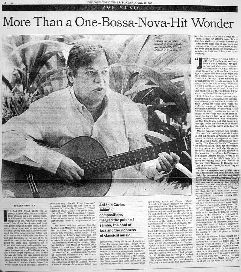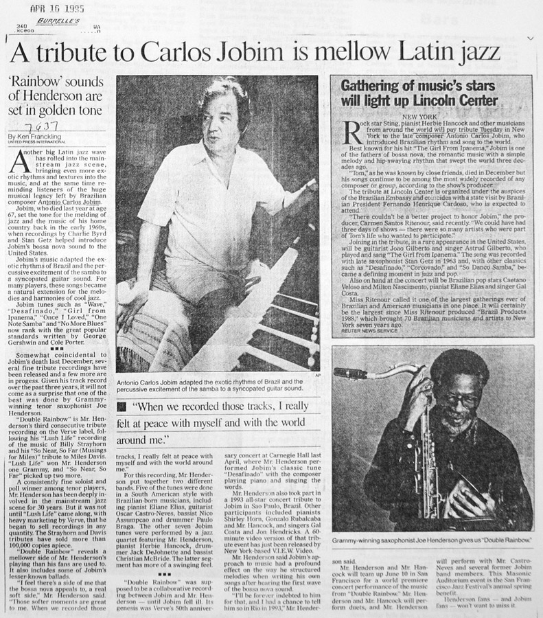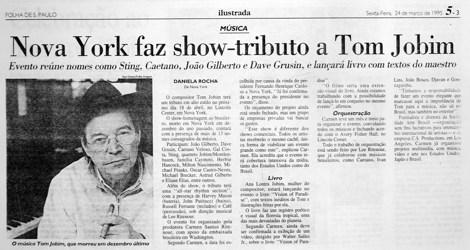 Concert in tribute to Tom Jobim with the participation of Sting, João, Herbie Hancok, Lee Ritenour, Caetano Veloso, Michael Brecker, Milton Nascimento, Dave Grusin, Eliane Elias, Jacques Morelenbaum, Astrud Gilberto, Familia Caymmi, Gal Costa, Oscar Castro Neves, Paulinho da Costa, Mike Shapiro e Vinnie Colaiuta, and All-star Rithm Section (Harvey Mason, John Patitucci, Russel Ferrante e Café).