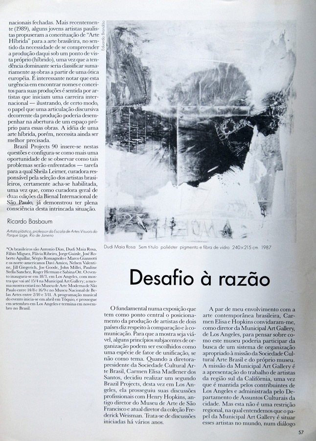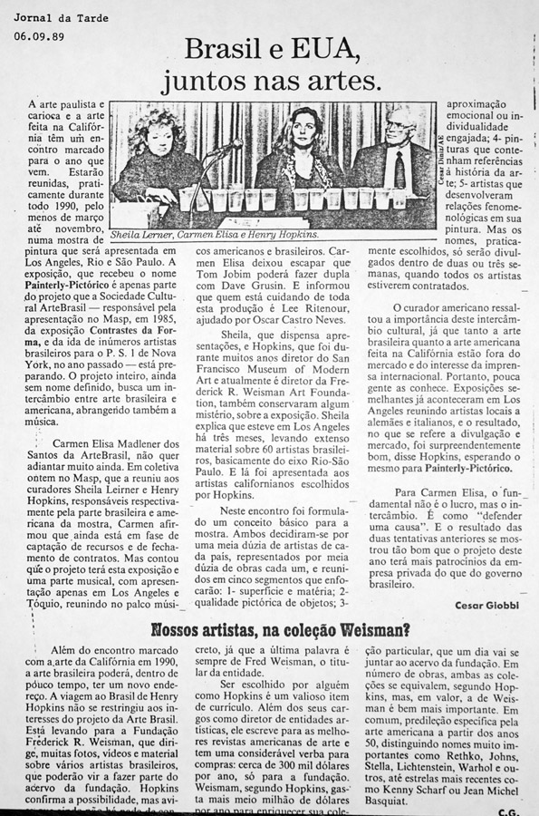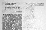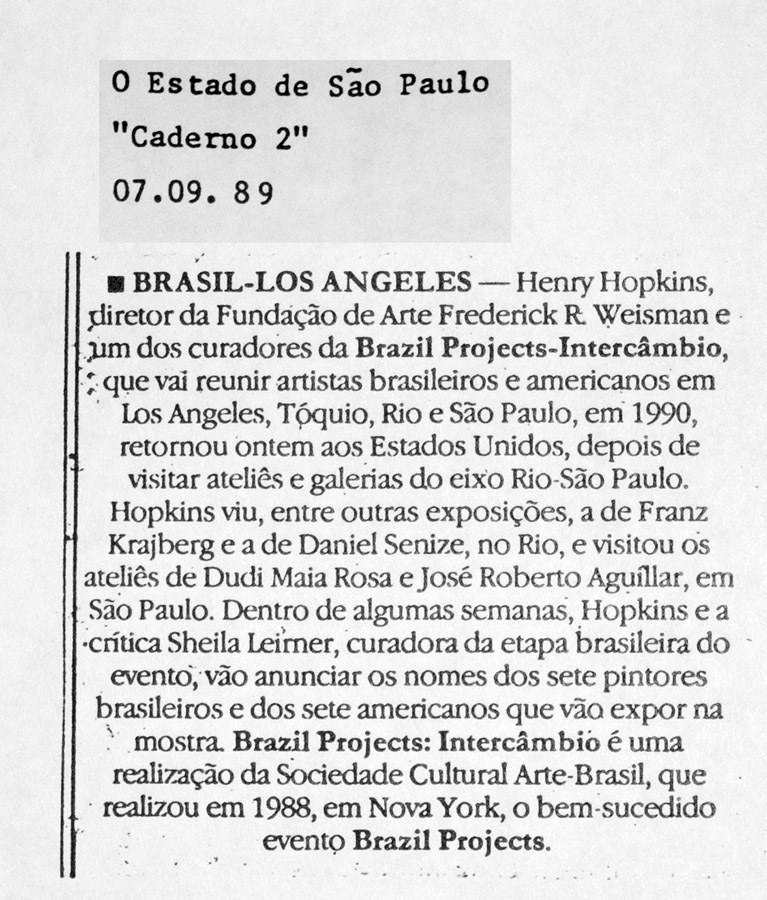 The exhibition brought together sixteen Brazilian and American visual artists, comprising a representative sample of the American avant-garde and comparable Brazilian artists. Participating artists: José Roberto Aguilar, David Amico, Antonio Dias, Jill Giegerich, Marco G. Gianotti, Joe Goode, Jorge Guinle, Roger Herman, Fabio Miguez, John Millei, Sabina Ott, Flavia Ribeiro, Sergio ST Romagnolo, Dudi Maia Rosa, Pauline Stella Sanchez, and Nelsen Valentine. Special guest musicians included João Bosco and Uakti Group.