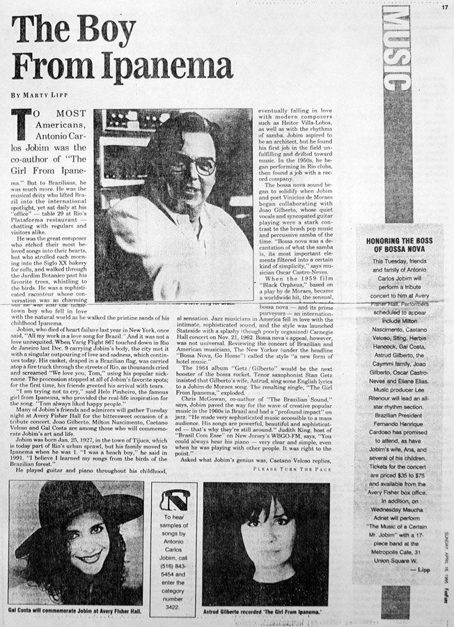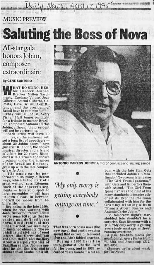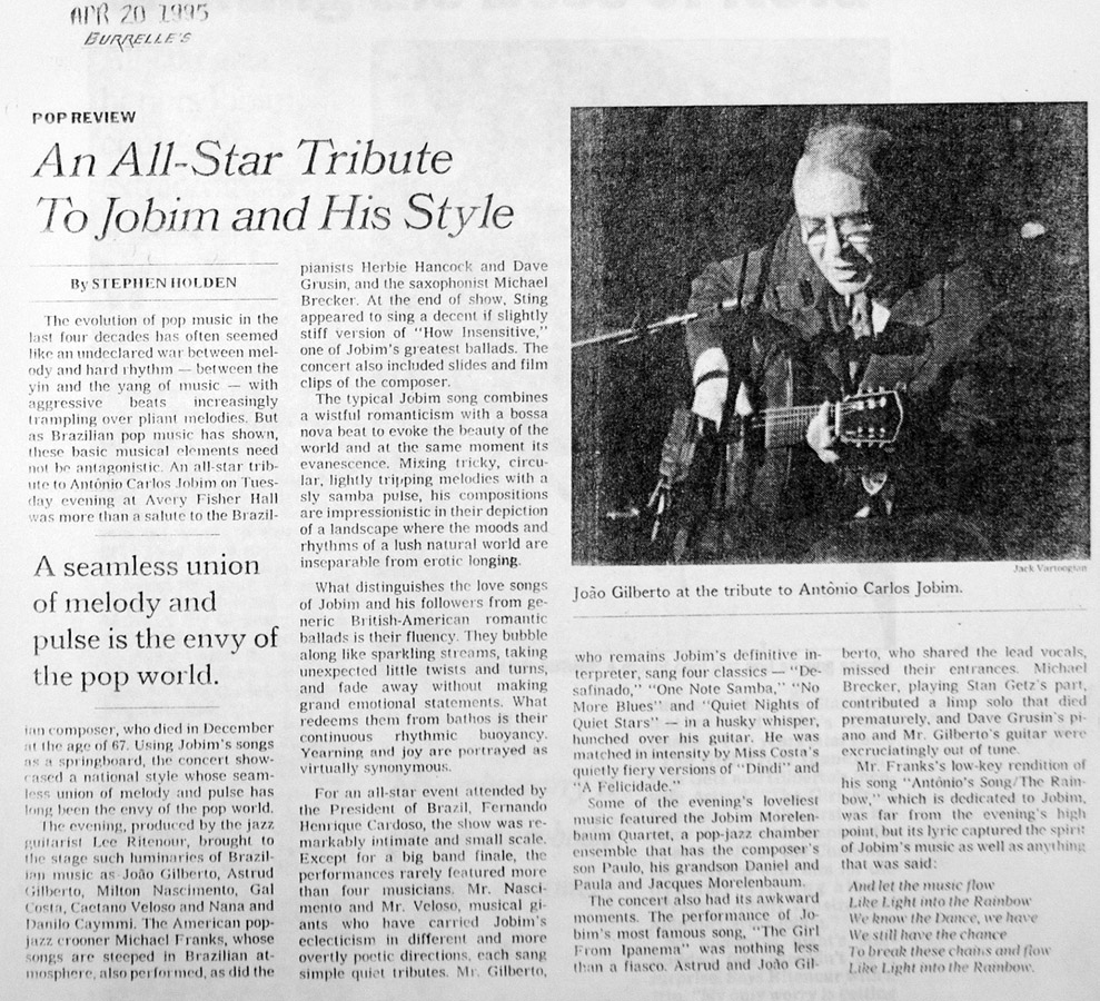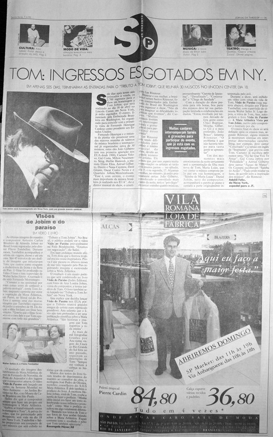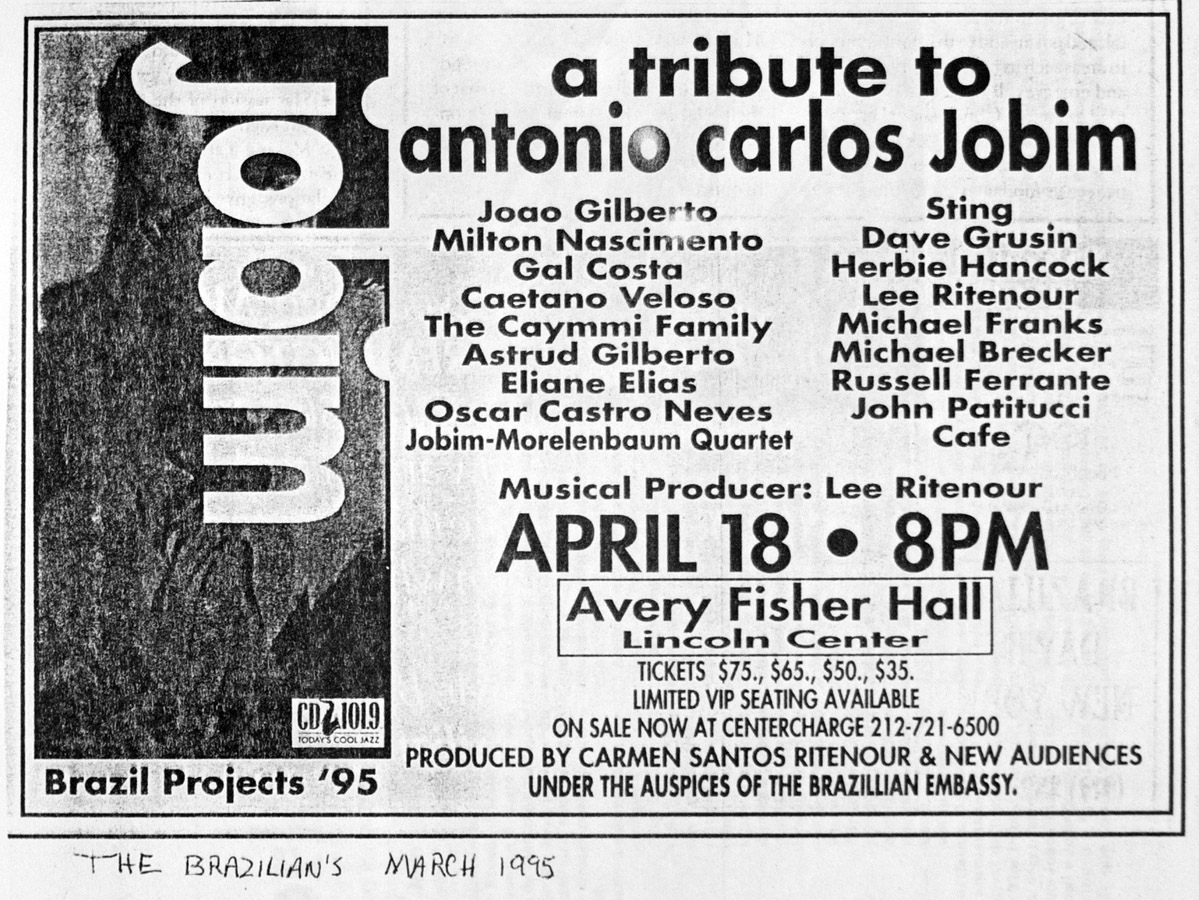 Concert in tribute to Tom Jobim with the participation of Sting, João, Herbie Hancok, Lee Ritenour, Caetano Veloso, Michael Brecker, Milton Nascimento, Dave Grusin, Eliane Elias, Jacques Morelenbaum, Astrud Gilberto, Familia Caymmi, Gal Costa, Oscar Castro Neves, Paulinho da Costa, Mike Shapiro e Vinnie Colaiuta, and All-star Rithm Section (Harvey Mason, John Patitucci, Russel Ferrante e Café).
